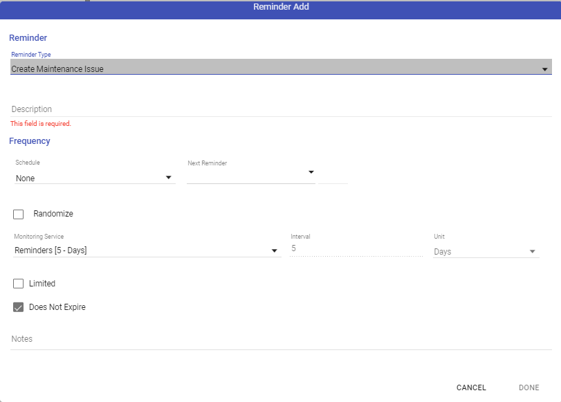 - Enter any notes that will append to the Maintenance Issue when raised by the reminder.
